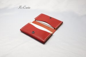 ナチュラル色とレッド色のヌメ革を使った、ツートンの名刺入れです。