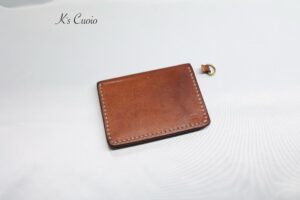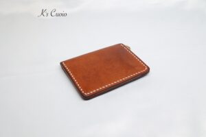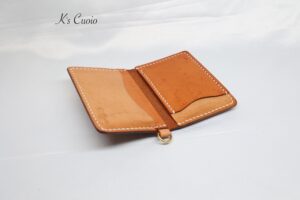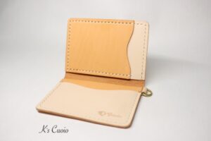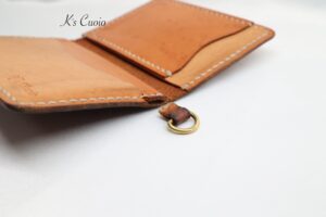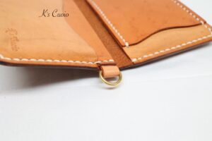 オレンジ色のヌメ革とナチュラル色のヌメ革のツートンタイプで、Dカンを追加で取り付けさせていただきました。